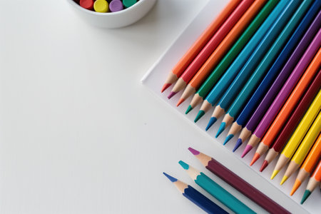 A neat arrangement of colored pencils on a clean white background, with vibrant hues displayed in perfect harmony, ideal for creative projects