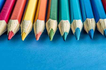 A line of various colored pencils neatly arranged in a row on top of a smooth blue surface. The pencils are vibrant and sharp, adding a pop of color to the otherwise monochromatic background.
