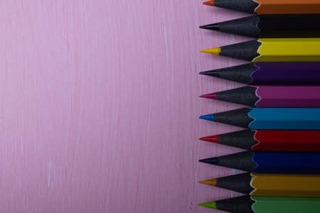 Color pencils on a light pink background. Top view with space for text. Back to school concept. Flat lay stationery mockup. Bright backplate for your design. Spectrum of different colors