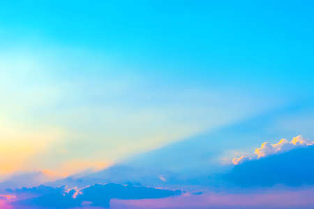 Beautiful twilight sunset sky and cloud at summer background image. New heaven light and earth concept. Dramatic sun ray with blue orange sky and pink purple clouds dawn texture color background