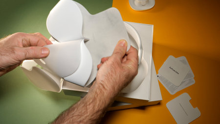 Paris, France - Jan 7, 2020: Removing plastic fom package of the best Apple Computers AirPods Max over-ear headphones with Adaptive EQ, Active Noise Cancellation, Transparency mode h1 chips and Siri