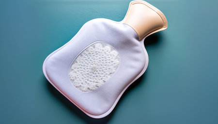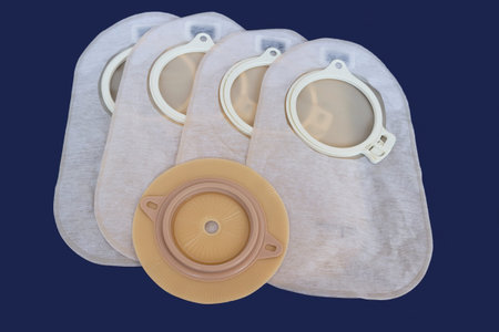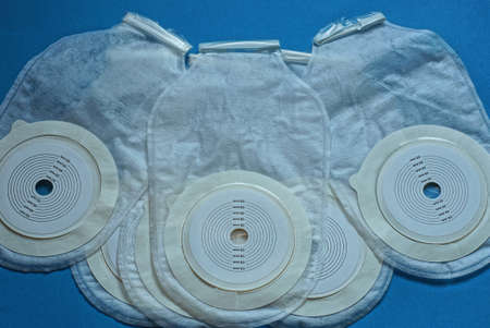 three white medical plastic colostomy bags on a blue background