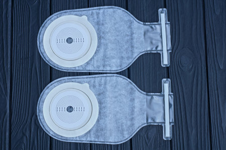 two white medical plastic colostomy bags lie on a black wooden table