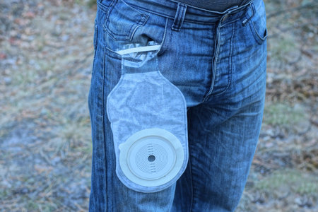 one white medical colostomy bag hanging on blue cotton jeans on man leg