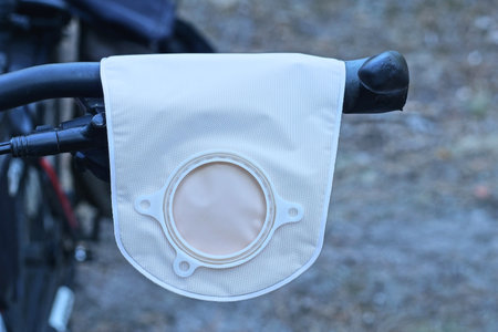 one brown plastic medical colostomy bag hanging on a black bicycle handlebar