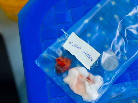Biological material of human flesh in a transparent bag for histological analysis, cut off during a surgical operation. The package has a digital inscription with a number and date.