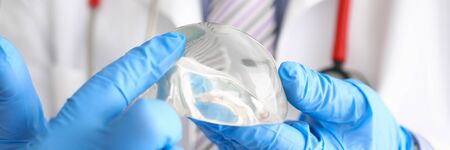 Surgeon in operation room is holding sterile breast silicone implant in hands.