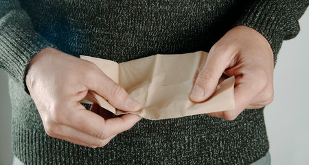 close-up of a man in a knitted sweater about to use a recycled paper tissue, with both hands stretching it open to reveal its plain surface