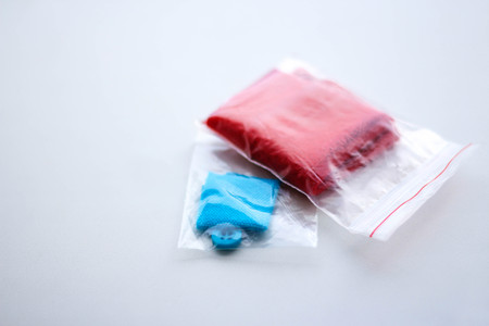 Blue button and the tissue sample in the bag. Closeup. Isolated on a white background.