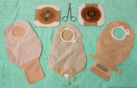 two plastic colostomy, on a blue table