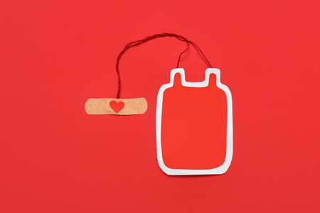 Blood pack for transfusion with medical patch on red background. Blood donation concept