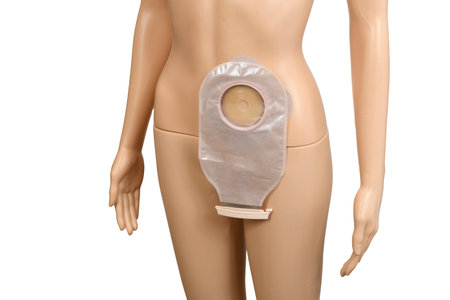 Vertical shot of a female mannequin wearing a two-part colostomy bag.