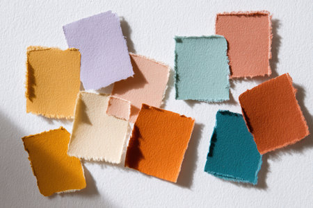Collection of colorful torn paper pieces arranged on a white textured background. The swatches feature a mix of warm and cool tones, including orange, teal, peach, lilac, and beige, showingcasing texture