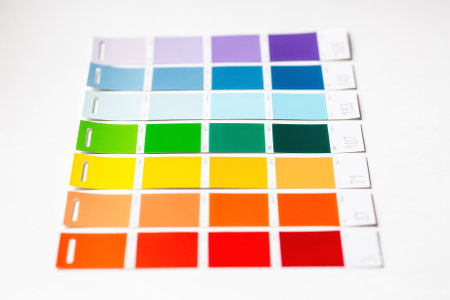 Banner of a color guide displaying a range of hues for use in interior design and decoration. Colorful color guide with a palette of paint samples on white background with copy space.