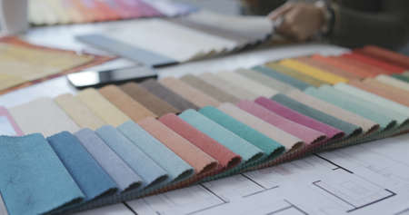 Close-up of designer sitting at the table with patterns and searching for the suitable color for the wall