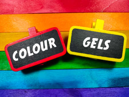 Text COLOUR GELS writing on colored wooden board on a colored ice cream sticks background. Trending photos concept.