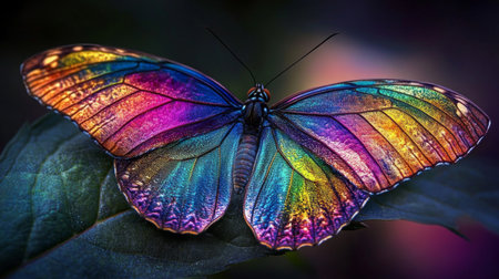 Stunning close-up of a colorful butterfly showcasing iridescent wings resting gracefully on a lush green leaf, capturing the beauty of nature.