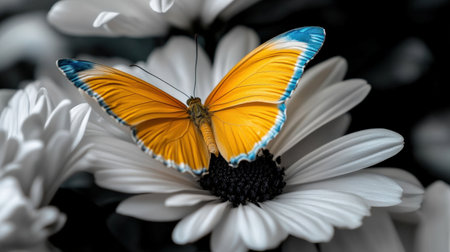 A brightly colored butterfly resting on a black-and-white flower uniqueness concept