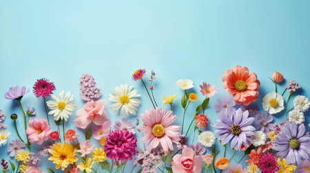Pastel floral background banner. Top view of pastel colored spring flowers in pink, white yellow, orange on blue background mothers day concept, copy space for text