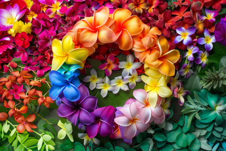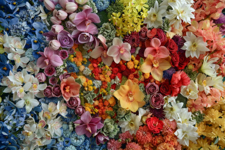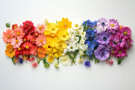A Colorful flowers arranged in rainbow gradient, joyful bloom display