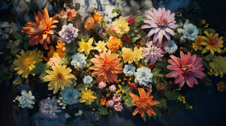 Vibrant overhead view of a floral arrangement, bursting with color and showcasing a variety of flowers