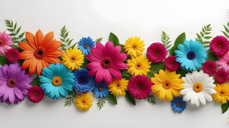 Colorful daisies and leaves on white background, top view. generated by AI.