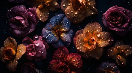 Flowers with drops of water close-up dark romantic background. wildflower wallpaper. AI generated
