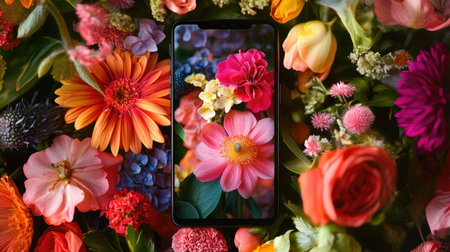 A stunning arrangement of colorful flowers surrounding a mobile device, showcasing the beauty of nature and technology harmoniously combined.