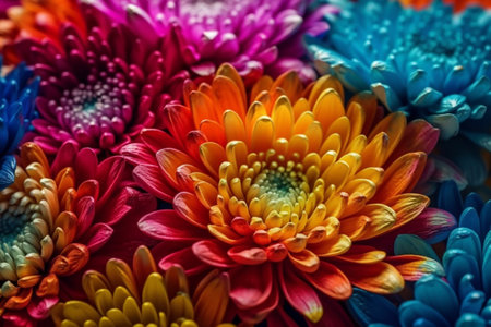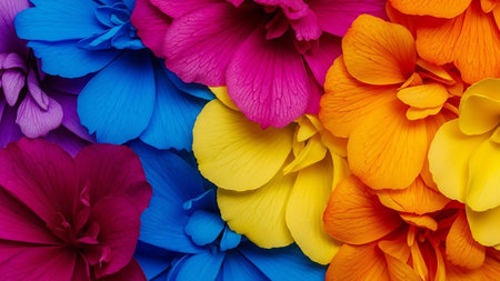 Close-up showing close-up macro view of overlapping flower petals in bold, saturated colors of magenta, electric blue, bright yellow, and vibrant orange, creating a...
