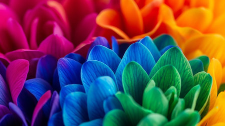 Extreme close-up of layered flower petals displaying a vibrant rainbow of colors from pink and blue to green and orange.