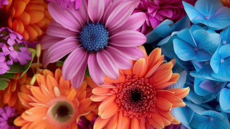 A stunning close-up capture of a vibrant floral arrangement featuring a delightful mix of blossoms in shades of pink, orange, and blue. Perfect for seasonal themes.