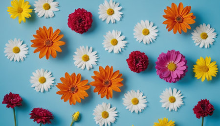 Colorful daisy flowers on blue background. Flat lay, top view