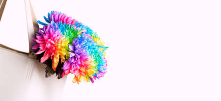 A bouquet of colored chrysanthemums in a white bag on a white background. Chrysanthemum is painted in rainbow colors. Banner, copyspace.
