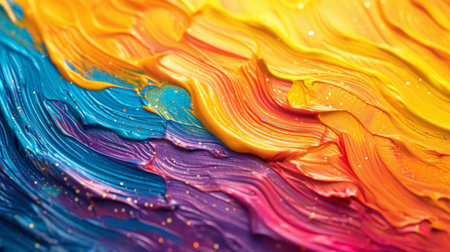 This image showcases a vibrant and dynamic display of swirling colors. The abstract composition features a blend of bright hues including pink, blue, yellow, and orange, creating a sense of movement and energy. The smooth transitions between colors suggest a fluid and harmonious interaction, evoking feelings of joy and creativity.