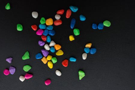 Colorful pebbles on dark background. Top view, flat lay