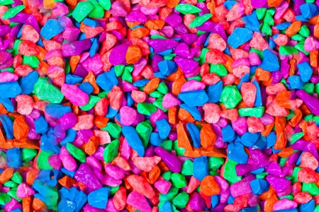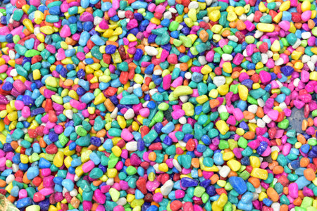 Vibrant colorful marble fine gravel. Simple stone background with bright multicolor pebbles. Stone texture. Top view of ground decor for garden with colorful natural stone