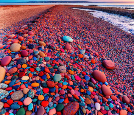 A collection of colorful stones arranged on a sandy beach, creating a visually appealing pattern.