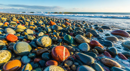 Colorful pebbles on the beach at sunset. Beautiful seascape.