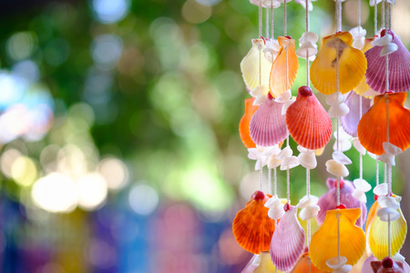Decoration from multi-colored seashells on a white background, copy-space for text.