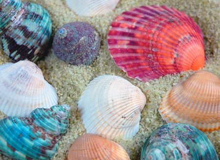Dyed scallop shells arranged closely together creating a cheerful and lively backdrop