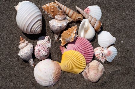 variety of sea shells from beach - panoramic - with large scallop shell.