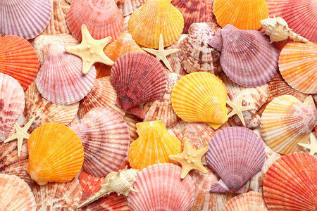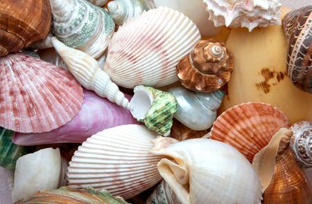 Seashells summer background. Lots of different seashells piled together, top view, close up