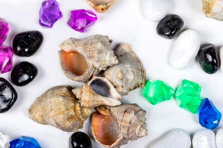 Bright background of their colored stones and seashells. Summer vacation and travel concept.