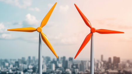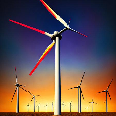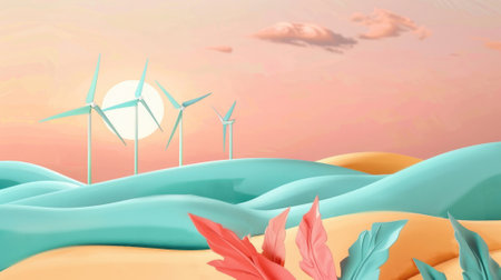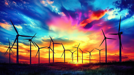 An artistic portrayal of wind turbines standing tall on rolling hills, bathed in vibrant sunset hues, representing clean energy and sustainable technology in nature.