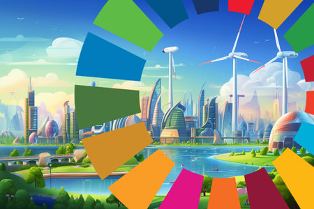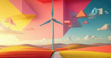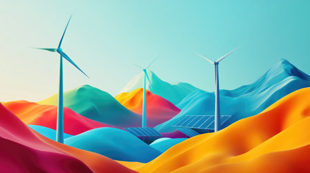 This vibrant abstract illustration showcases renewable energy sources, featuring wind turbines and solar panels against a colorful landscape, emphasizing sustainability.