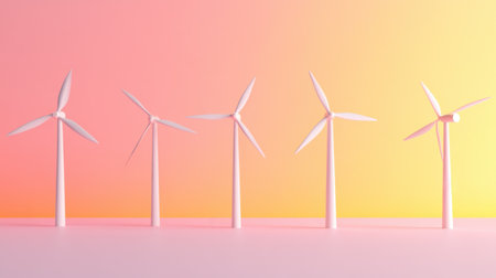 A serene image of white wind turbines arranged in a line against a vibrant pastel gradient sunset. The turbines symbolize renewable energy and sustainability.