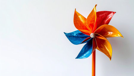 A brightly colored toy pinwheel stands against a clean white background, its vibrant red, orange, and blue blades poised to catch the slightest breeze. This simple object evokes feelings of childhood nostalgia, carefree summer days, and the pure joy of simple pleasures. The ample copy space makes it perfect for creative projects and messages of optimism and fun.