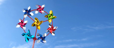 Closeup of colorful pinwheel twirls gracefully in the wind, reminding viewers of the joys of travel, summer holidays, and vacation time.