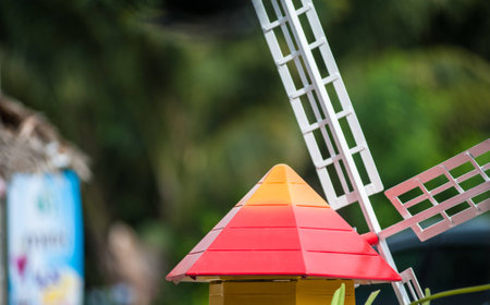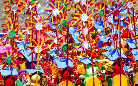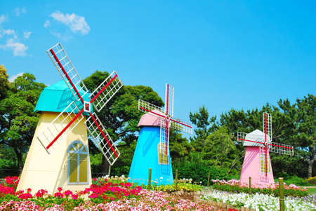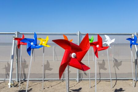 colorful windmill toy standing on Iho Tewoo Beach, Jeju island, South Korea
