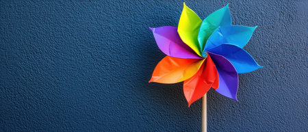 A Colorful pinwheel spinning against blue wall, proud symbol of joy and playfulness